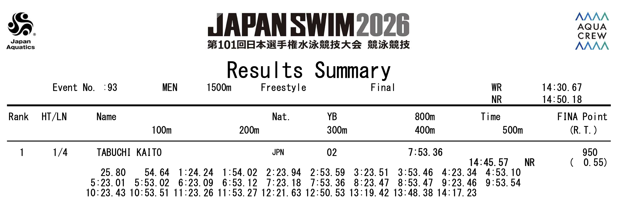 Record nazionale e miglior tempo mondiale stagionale nei 1500 stile libero per Kaito Tabuchi (24) con il tempo di 14:45.57, vince davanti al giovane connazionale Kazushi Imafuku (2007), l'altro ieri al primato giapponese negli 800 metri, oggi nuota la distanza con un ottimo 14.52.45.