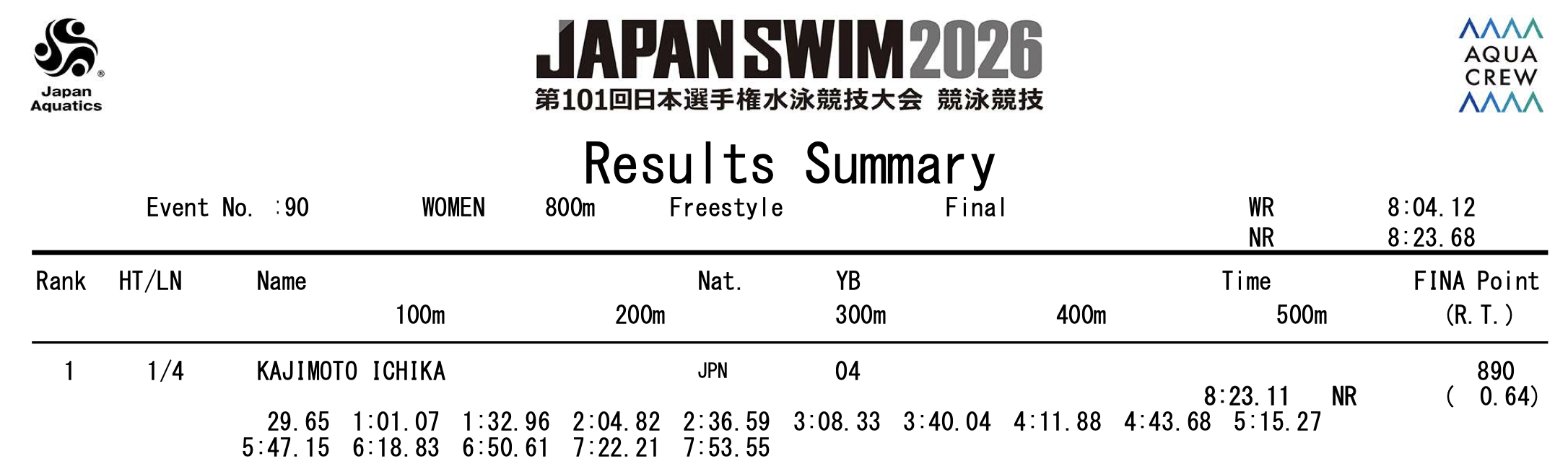 Day 4. 400 misti maschili di altissimo livello con Tomoyuki Matsushita che si impone in 4:06.93, miglior tempo mondiale stagionale. Alle sue spalle brilla Yumeki Kojima (2008), secondo in 4:08.84 con record mondiale junior, crono che vale anche la quarta prestazione mondiale dell’anno. Completa il podio Asaki Nishikawa in 4:08.87, quinto tempo nel ranking internazionale stagionale della specialità. Da segnalare come Yumeki Kojima fosse già protagonista sui 200 misti, dove aveva nuotato 1:56.53 siglando anche in quel caso il record mondiale junior.