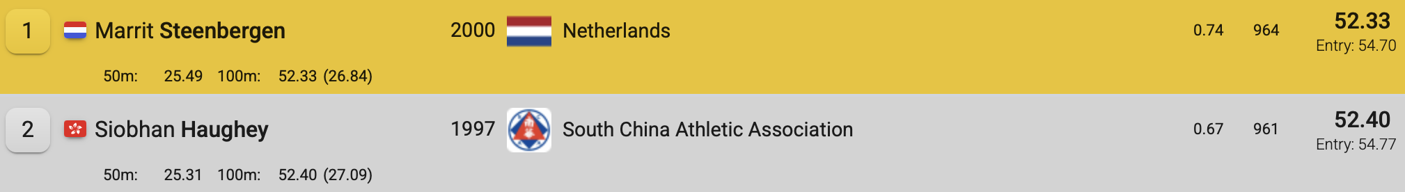 Day 2. Nella seconda giornata di gare una delle finali più attese era senza dubbio i 100 stile libero femminili, che hanno rispettato le aspettative. La sfida tra Marrit Steenbergen e Siobhan Haughey ha prodotto i due migliori tempi mondiali stagionali, ha vinto la liberista olandese con 52.33 contro il 52.40 della collega hongkonghese. La Steenbergen ha poi bissato la vittoria con l'oro nei 200 misti (2:11.60), a conferma di una versatilità sempre più interessante