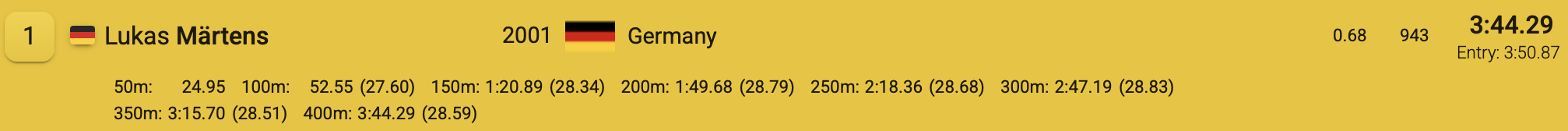 ALTRI VINCITORI. 100 RA F – Olivia Klint Ipsa (SWE) – 1:08.08. 50 SL M – Matt King (USA) – 21.72. 400 SL F – Anna Peplowski (USA) – 4:10.82. 200 MX M – Luke Barr (USA) – 1:58.93. 100 DO F – Anna Peplowski (USA) – 1:00.04. 50 DO M – Finn Brooks (USA) – 25.15. 200 FA F – Marthe Cecile Willumsen (NOR) – 2:19.94. 50 SL F – Barbara Janickova (CZE) / Marrit Steenbergen (NED) – 24.81. 400 SL M – Lukas Märtens (GER) – 3:44.39. 200 SL M – Lukas Märtens (GER) – 1:45.67 .....