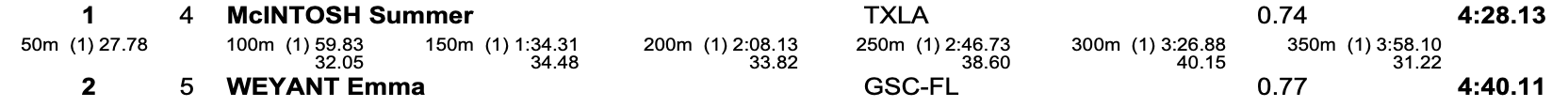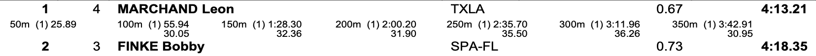 I due migliori nuotato dell'anno, la canadese Summer McIntosh e il francese Lèon Marchand, dopo la vittoria dei 200 misti vincono anche la doppia distanza di specialità, rispettivamente con 4:28.13 e 4:13.21.