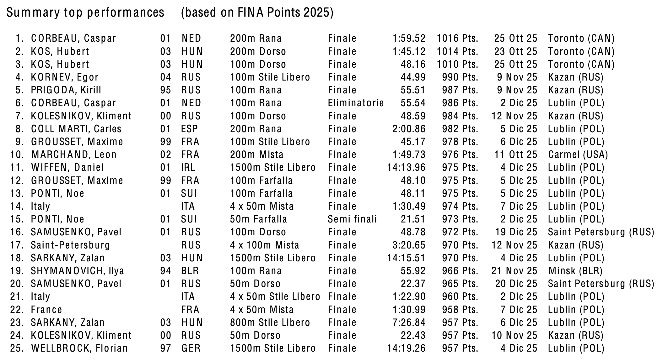 Sono disponibili le graduatorie e le top ten continentali in vasca corta (Swimrankings) aggiornate dopo i Campionati Europei di Lublino, i Campionati italiani di Riccione e la Salnikov Cup di San Pietroburgo. Gli azzurri Simona Quadarella, Simone Cerasuolo e Alberto Razzetti risultano in testa al ranking di specialità; rispettivamente dei 1500 stile libero, 50 rana e 400 misti. Ventitrè azzurri sono presenti nelle top ten; 13 uomini e 10 donne per un complessivo di 37 presenze, contro le 51 della Russia e le 47 della Gran Bretagna.