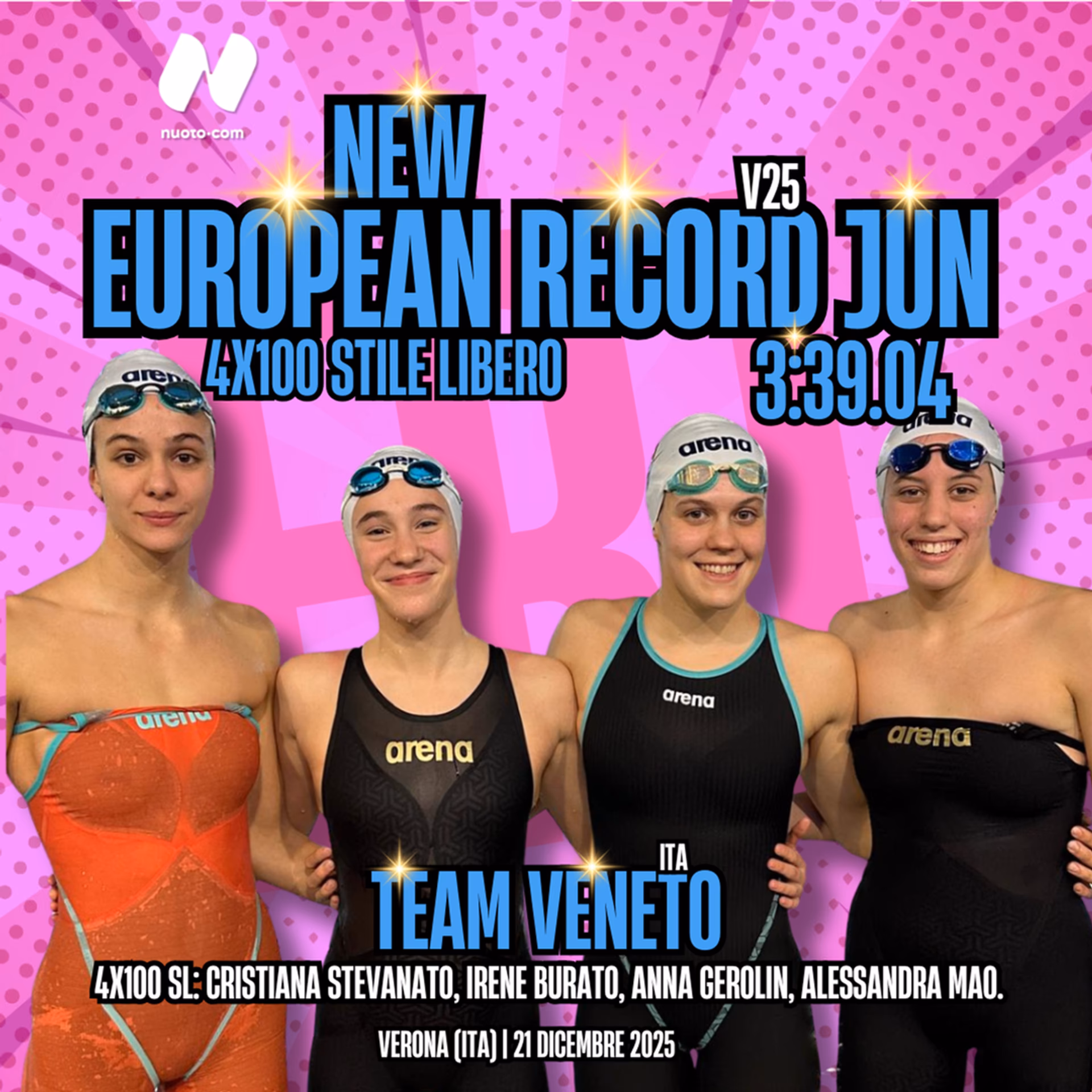 Nel corso della Coppa Caduti di Brema, disputata al Centro Federale di Verona, il quartetto della 4×100 stile libero femminile del Team Veneto ha firmato il nuovo record europeo juniores della specialità con il tempo di 3.39.04.. A realizzare l’impresa sono state Cristiana Stevanato (54.85), Irene Burato (55.08), Anna Gerolin (54.78) e Alessandra Mao (54.33). Il precedente limite continentale giovanile appparteneva al team dell'Aqua Alpha che lo siglò lo scorso 28 marzo ai Criteria Giovanili di Riccione.