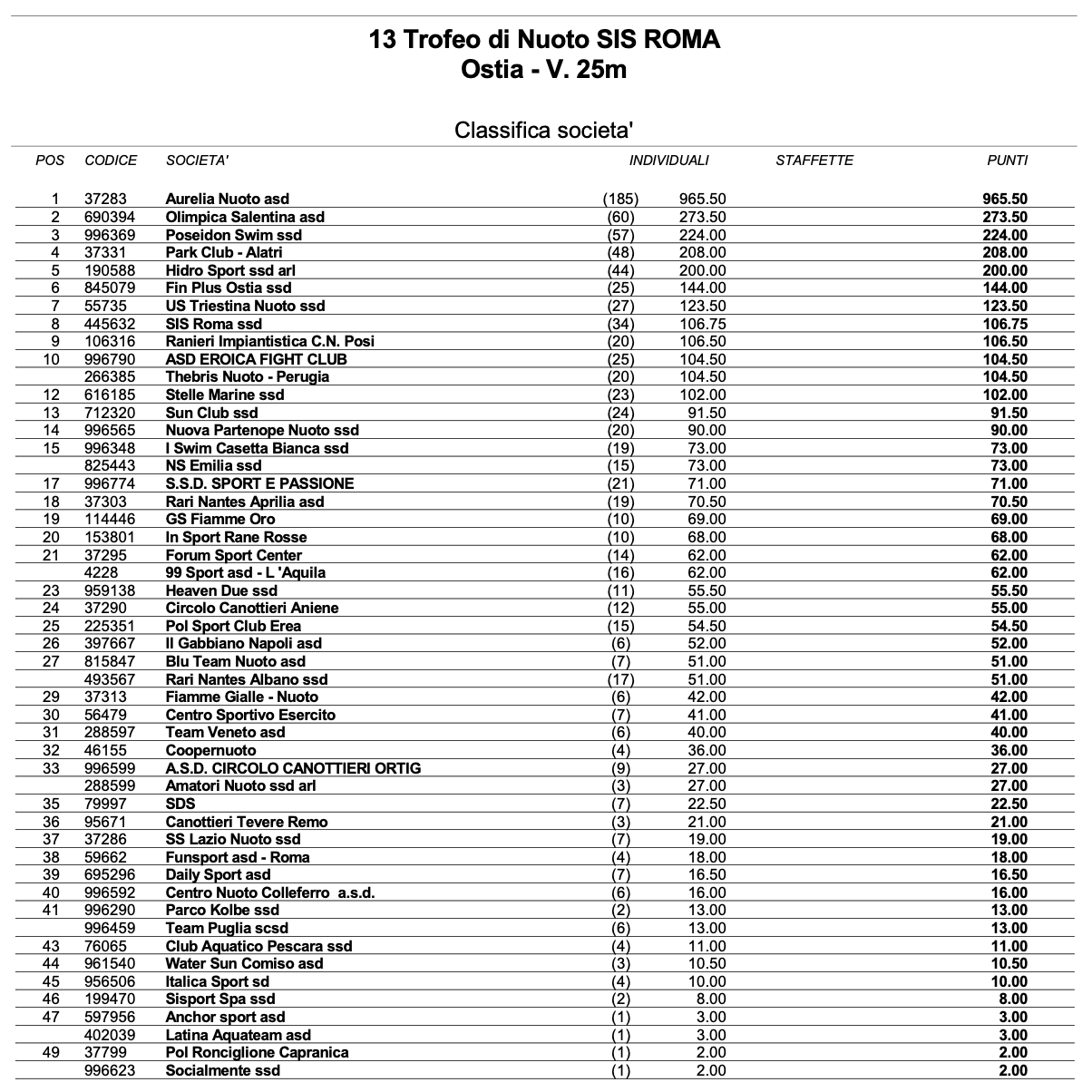 Disponili i risultati completi del XIII Trofeo di Nuoto SIS Roma svolto in vasca corta presso il Centro Federale Polo Natatorio di Ostia (Roma).