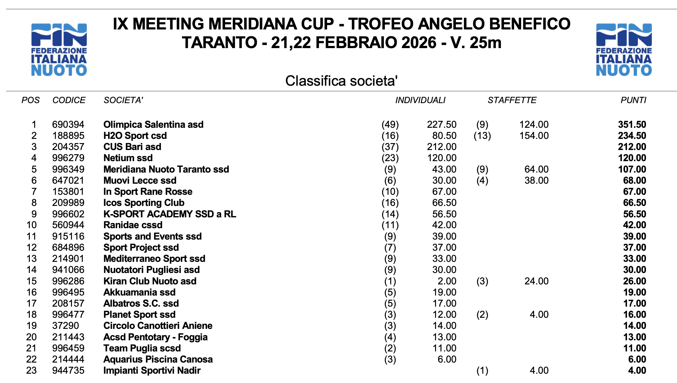 Sono disponibili sull'App My Fin i risultati completi del meeting nazionale Meridiana Cup 2026 svolto in vasca corta presso la piscina Meridiana di Taranto.