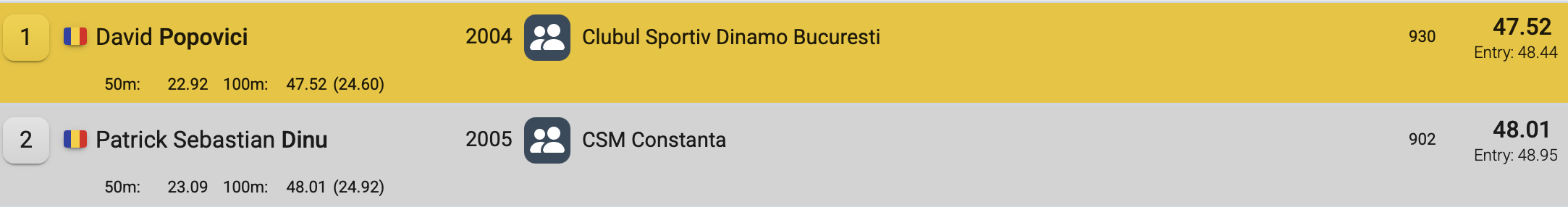 Il campione del mondo David Popovici si impone in 47.52, dopo aver già ieri nuotato un 46.97 lanciato in quarta frazione di staffetta, il suo è il quinto crono mondiale stagionale. Molto interessante anche il 48.01 di Patrick Dinu, sempre più vicino al muro dei 48 secondi.