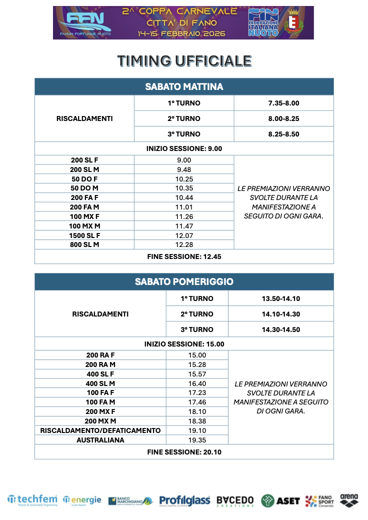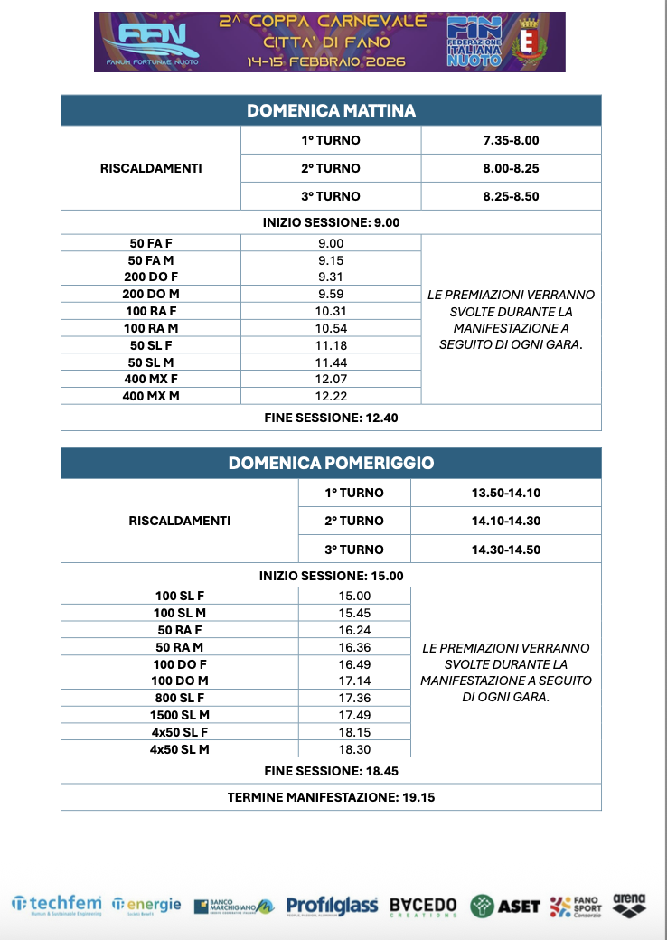 Sono disponibili startlist, timing e live streaming della seconda edizione della Coppa Carnevale Città di Fano, in programma nel fine settimana presso il Centro Natatorio “Nuotiamo” della Città di Fano in vasca da 25 metri con organizzazione a cura della società Fanum Fortunae Nuoto ASD.