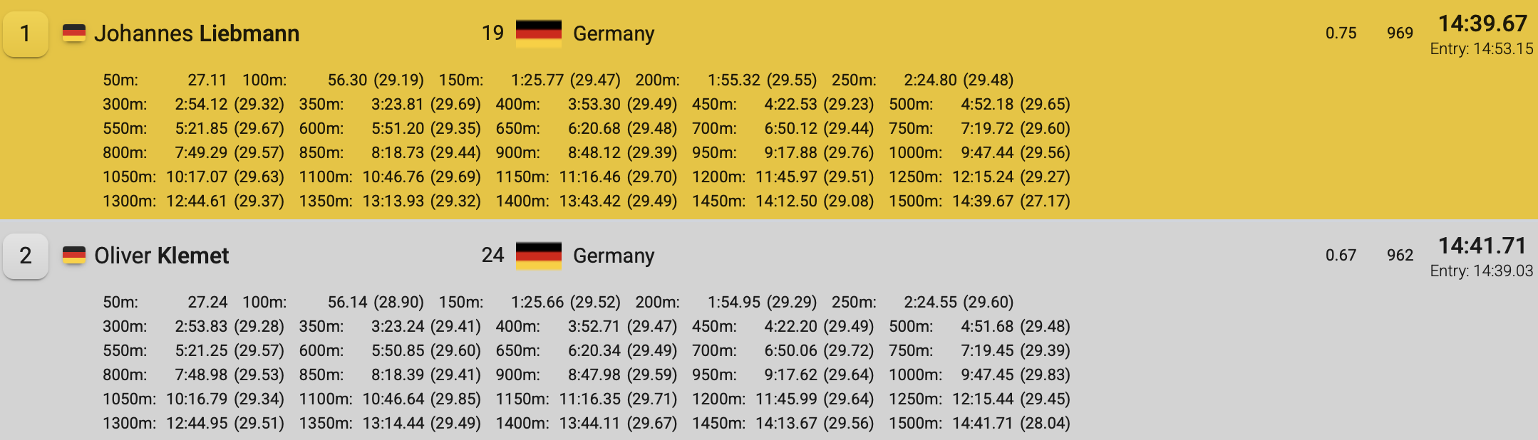 DAY 3. Ancora ottimi riscontri cronometrici dall’Eriksdalsbadet di Stoccolma, in particolare nella prima serie dei 1500 stile libero uomini, che vede una tripletta tedesca sul podio ma con un ordine d’arrivo non previsto: a imporsi è il talentuoso 19enne Johannes Liebmann, autore del miglior tempo mondiale stagionale in 14:39.67, a ridosso della top ten all-time della specialità. Alle sue spalle il connazionale e compagno di allenamento Oliver Klemet, che nuota il secondo crono dell’anno (14:41.71) dopo aver condotto la gara fino ai 1100 metri, mentre sul terzo gradino del podio chiude l’esperto Florian Wellbrock in 15:15.79. Tutti e tre fanno parte del gruppo di Magdeburgo guidato dal tecnico Bernd Berkhahn.