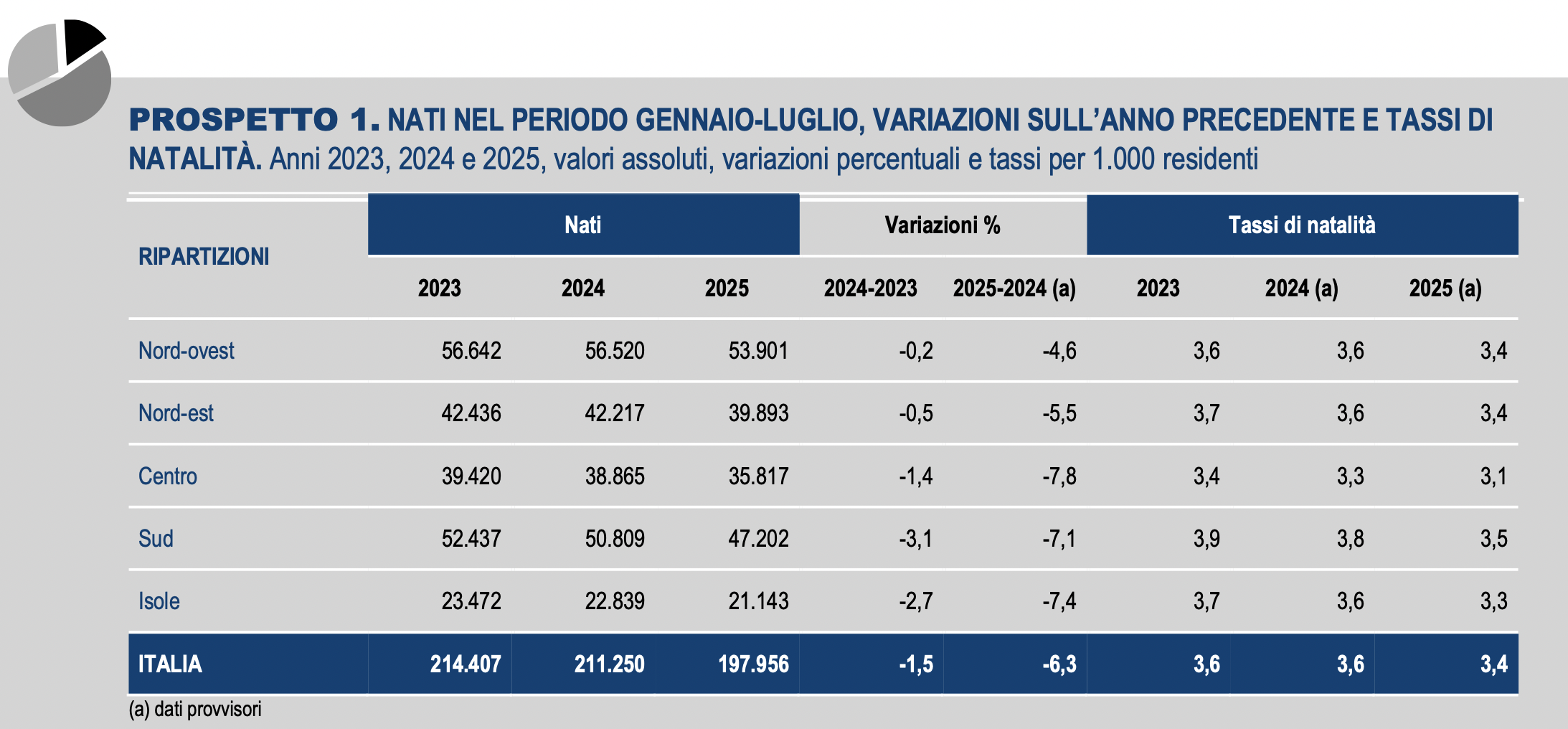 Secondo l’ultimo rapporto ISTAT, la natalità in Italia continua a scendere, toccando nuovi minimi storici. Nel 2024 sono nati 369.944 bambini, quasi 10mila in meno rispetto all’anno precedente (-2,6%). Il tasso di fecondità medio per donna si ferma a 1,18 figli, in ulteriore calo rispetto al 2023 (1,20). Le stime provvisorie dei primi sette mesi del 2025 delineano un quadro ancora più critico: 1,13 figli per donna e circa 13mila nascite in meno rispetto allo stesso periodo del 2024 (-6,3%).