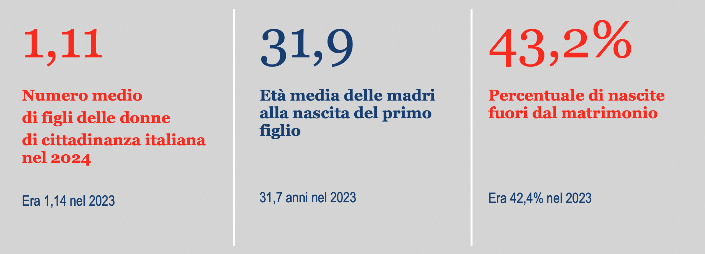 Dal 2008, quando si registrarono oltre 576mila nascite, l’Italia ha perso 207mila bambini (-35,8%), con un tasso di natalità crollato da 9,7 a 6,3 per mille residenti. Le cause restano note: precarietà lavorativa, difficoltà di accesso alla casa, posticipo dell’uscita dal nucleo familiare e rinuncia o rinvio alla genitorialità.